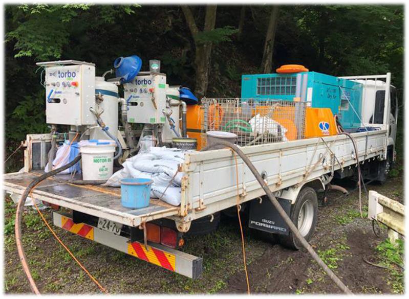 torboはタンク内で水と砂を加圧した泥化研削材による湿式ブラスト工法。