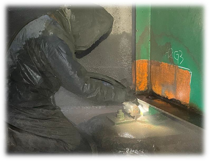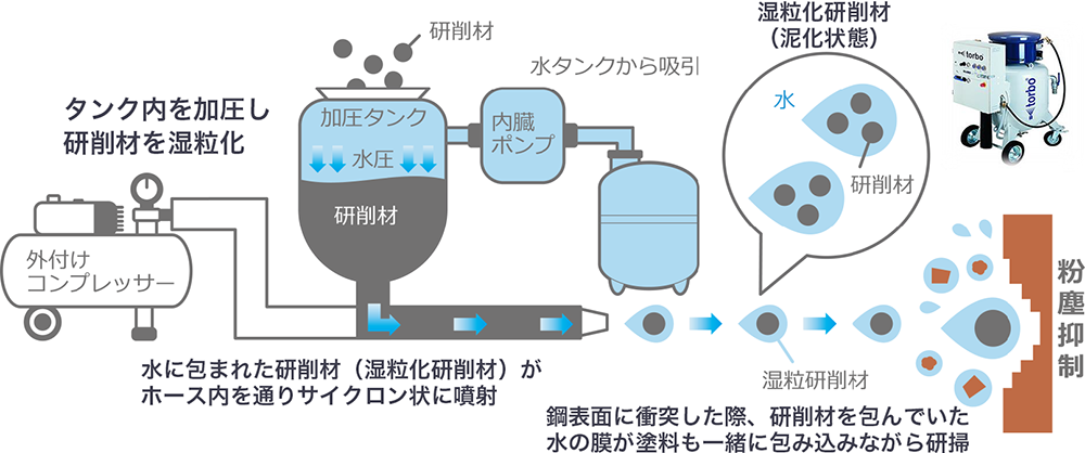 torboはタンク内で水と砂を加圧した泥化研削材による湿式ブラスト工法。